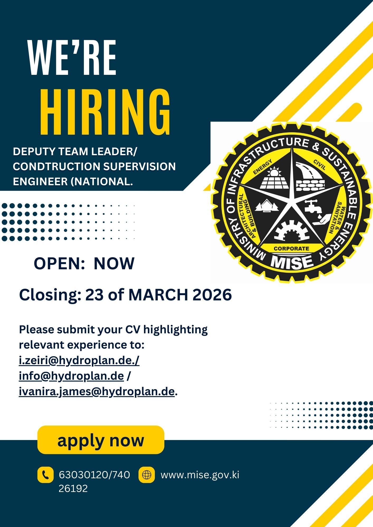 Hydroplan is seeking a qualified Deputy Team Leader / Construction Supervision Engineer (National) to support implementation and supervision services for a donor-funded water supply and sanitation infrastructure project in Kiribati. The assignment involves supporting the Team Leader in overseeing construction supervision activities, ensuring quality control of infrastructure works, and assisting national counterparts throughout the implementation and commissioning phases of the project. Scope of Work The Deputy Team Leader / Construction Supervision Engineer will support the coordination and supervision of project implementation, with responsibilities including: • Assisting the Team Leader in overall coordination of construction supervision activities • Supervising construction works related to water supply and sanitation infrastructure • Reviewing engineering designs, technical specifications, and contractor submissions • Ensuring construction quality, compliance with technical standards, and adherence to contract requirements • Supporting procurement processes and contract administration for works and equipment • Monitoring construction progress, schedules, and contractor performance • Assisting with testing, commissioning, and handover of completed infrastructure • Supporting environmental, health, and safety compliance during construction • Coordinating with government counterparts, contractors, and stakeholders • Contributing to project reporting, monitoring, and documentation The role requires close collaboration with the project management unit, executing agencies, contractors, and donor representatives to ensure timely and high-quality delivery of project outputs. Minimum Qualifications Education: • Bachelor’s degree in Civil Engineering or a related field • Chartered Professional Engineer (or equivalent professional registration) preferred Experience: • 8–10 years of professional experience in water supply and sanitation infrastructure projects • Demonstrated experience in design, procurement, construction supervision, and commissioning of water and sanitation systems • Proven experience supervising civil works and managing contractors on infrastructure projects • Familiarity with international construction standards and contract management procedures • Experience working on donor-funded infrastructure projects (e.g., Asian Development Bank, World Bank) is considered an asset • Previous experience in small island developing states or remote project environments is an advantage How to Apply Please submit your CV highlighting relevant experience to i.zeiri@hydroplan.de./ info@hydroplan.de / ivanira.james@hydroplan.de Applications should be submitted no later than 23 March 2026. Only shortlisted candidates will be contacted. Ensure the subject line reads: Application – Deputy Team Leader / Construction Supervision Engineer – Kiribati